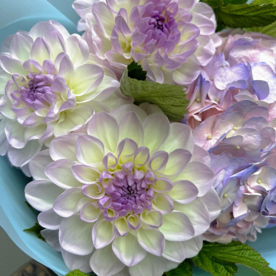 На фото букет из гортензии и георгинов. В составе: георгина 3 шт, гортензия 1 шт, зелень 4 шт, дизайнерская упаковка 1 шт, атласная лента 1 шт, . Все цветы свежие и ароматные, букет красиво оформлен и отлично подходит для подарка. Доступна доставка цветов или самовывоз.